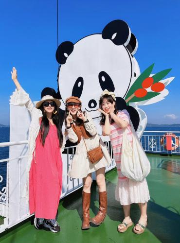 小豆島是瀨戶內海的一座離島,我們前往小豆島,依然需要乘坐輪渡,在高松港的碼頭就可以買票,船程大約需要40分鐘的樣子,這次很幸運,坐了熊貓主題的輪渡,在甲板上拍照,十分快樂。