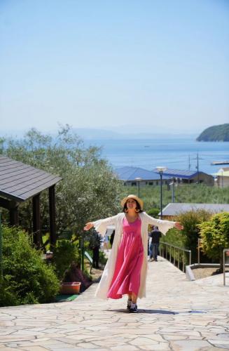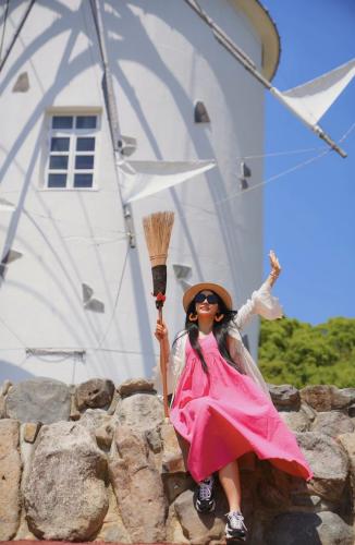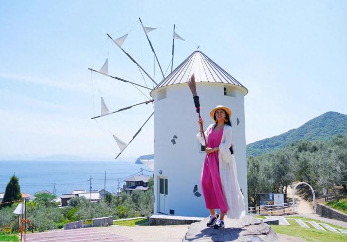在小豆島,吃一份橄欖雞肉飯,讓我們接著去探索小豆島吧,白色的風車是魔女宅急便的拍攝地,這裡可以免費提供掃帚,拍攝動畫片裡的同款照片,那就來做一天魔法仙女吧。