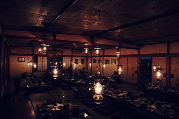 旅館主人原田篤久先生親自迎接客人,他也是青荷溫泉的擁有者。環顧四周,旅館主館大堂中吊著五盞泛著微黃火光的老式煤油燈,通往客房的深黑走廊裡,也懸著一盞搖搖晃晃的風燈,真有穿越時空之感。“這裡幾乎沒有電,”原田先生略為抱歉地解釋道。旅館的房後放著小型自家發電機,只夠應付緊急需要。而旅館的名字,也應景地取為“油燈之宿”,貼切之餘又有種簡樸的禪意。